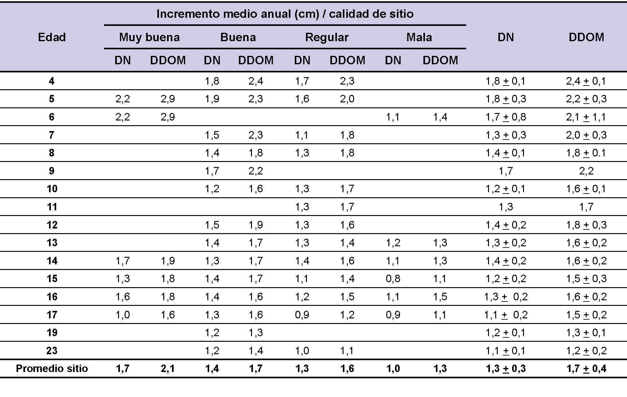 Si bien el incremento medio anual tanto en DN como en DDOM en los sitios de mejor calidad es igual o superior la media general para la muestra (DN:1,3; DDOM:1,7), hay valores que son menores como por ejemplo los que figuran a los 15 y 17 años en los sitios de muy buena calidad (tabla 2). Esto podría explicarse por la menor densidad observada en esos casos puntuales. Además se puede ver que, los valores en general resultan superiores a 1 cm.año-1 lo cual muestra el buen desempeño de la especie frente a variaciones de sitio. Estos resultados son promisorios y concuerdan con los citados por Senilliani y Navall (2006) y Michela et al. (2015) para etapas juveniles de plantaciones con esta especie. Si consideramos el crecimiento de la especie en ambientes de bosque nativo del Chaco árido, Juárez de Galindez et al., (2005) indican valores inferiores a los de nuestro estudio para el periodo inicial, no obstante, dada la elevada densidad de las plantaciones, el crecimiento en diámetro de los árboles dominantes reflejaría con mayor aproximación la potencialidad de cada sitio y edad para estimar producciones maderables con destino a la industria del mueble.