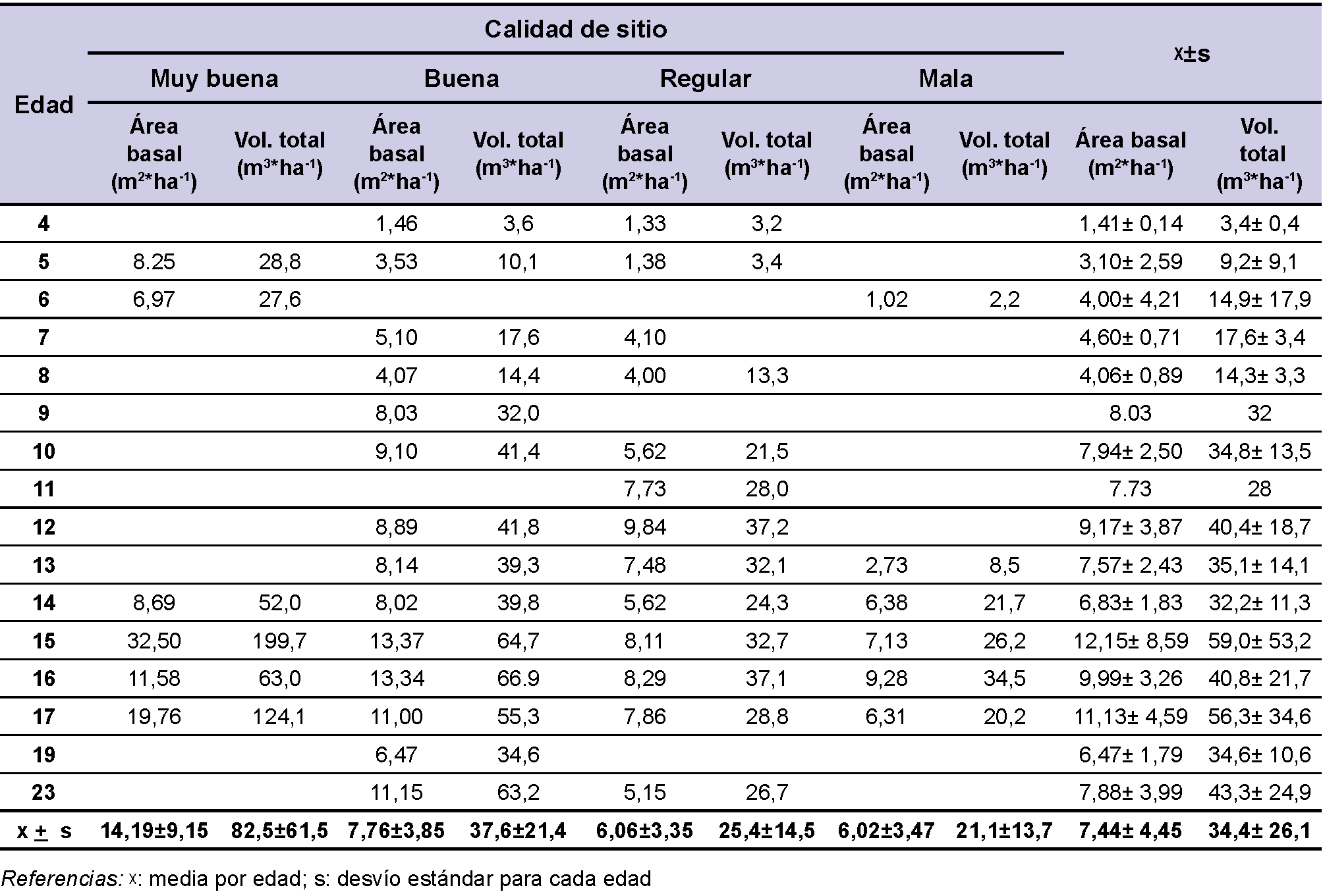 Para el área basal y el volumen total, también se observó una marcada diferencia entre sitios (tabla 3), los mejores sitios prácticamente duplicaron los valores de las demás calidades, pudiendo superar incluso en sitios de muy buena calidad los valores citados por Senilliani y Navall (2006) como límite de densidad para el área de riego de Santiago del Estero. En las parcelas de 17 años, donde se tienen todas las clases de sitio representadas, el volumen en los sitios muy buenos fue el doble al de los sitios buenos y 4 veces superior al de los sitios regulares. A los 23 años el sitio bueno tuvo el doble de volumen que el regular; estos resultados refuerzan la idea de que es altamente recomendable que además de ubicar las plantaciones en las mejores estaciones o sitios también se debe manejar la densidad para lograr buenos resultados.