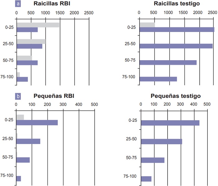 Tratamiento*tamaño de raíces. La densidad de raicillas fue 775 ± 725 raíces.m-2 en el rolado y 1064 ± 1100 raíces.m-2 en el testigo, pero considerando ambos grupos funcionales en todo el perfil. En el testigo solo se cuantificaron raicillas de gramíneas nativas en la primera clase de profundidad, mientras que en el RBI se observaron además los otros tamaños hasta el metro de profundidad.