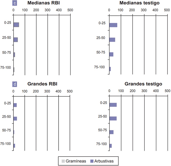Grupo funcional. En términos absolutos, la densidad de raíces de arbustivas fue significativamente mayor que la de gramíneas, (media ± DE: 401 ± 731 versus 115 ± 402,07 raíces.m-2, respectivamente: p<0,0001), englobando tratamiento, tamaño de raíces y profundidad de suelo (fig. 1). La densidad media de raíces de gramíneas fue mayor en el RBI y pertenecieron a M. máximum, mientras que en el testigo pertenecieron a los géneros Trichloris, Setaria, y Gouinia.