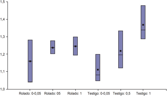 Los valores de Dap observados oscilaron entre 1,03 y 1,47 g.cm-3. La Dap no fue influenciada por tratamiento (p= 0,75), pero sí por profundidad de suelo (p<0,0533). No se observó diferencia significativa entre RBI y testigo (1,21 g.cm-3 versus 1,23 g.cm-3, respectivamente). La mayor Dap media se observó a mayor profundidad (fig. 2). La Dap media no superó en ningún caso el umbral crítico propuesto para suelos francos.