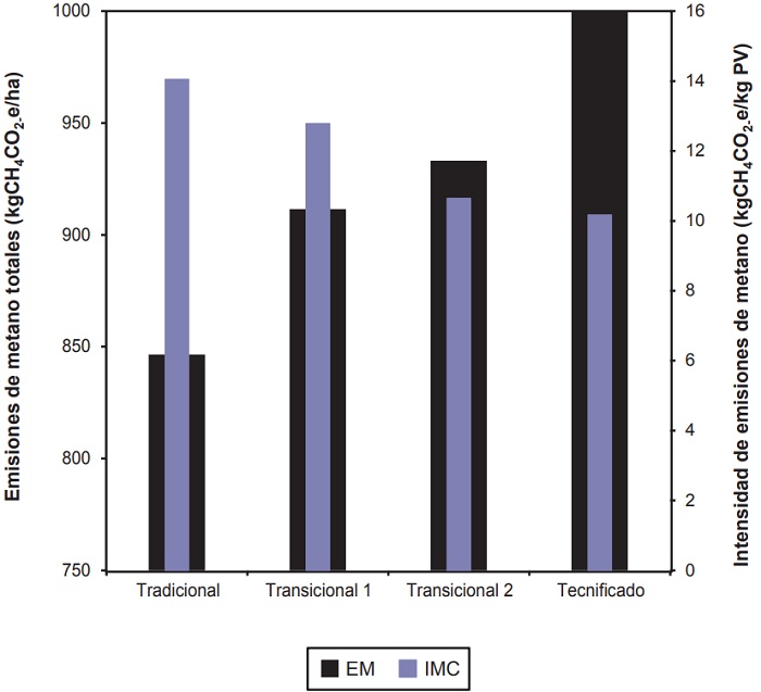 La EM (kgCH4CO2-e/ha) aumentó un 18% desde Trad hasta Tecn, mientras que la IMC (kgCH4CO2-e/producción total) disminuyó 28% desde Trad hasta Tecn (figura 1). El aumento en productividad se asoció con menor intensidad de emisión de metano (IMC=20,4-0,1 x producción de carne, R2 0,98).