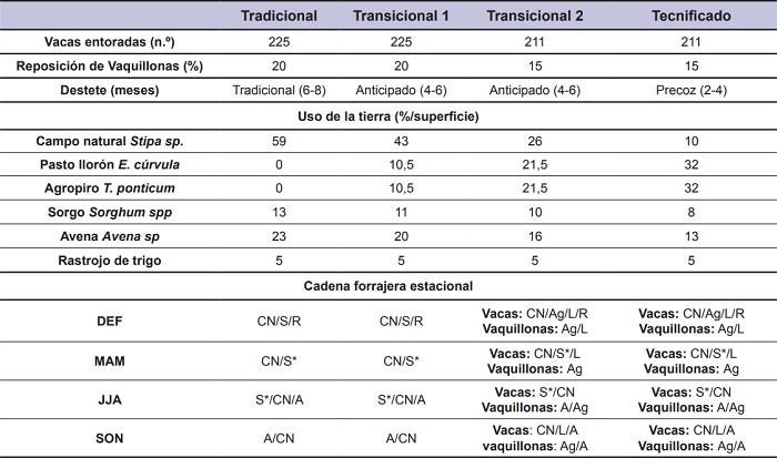 En los sistemas productivos de cría vacuna de la zona se describen tres perfiles productivos (Lauric et al., 2017), y por mayor representatividad se consideró en este estudio el sistema modal “Tradicional” (Trad) como modelo base y el “Tecnificado” (Tecn) acorde a lo reportado por (Lauric et al., 2016). A estos sistemas reales extremos Trad y Tecn, se adicionaron dos sistemas artificiales denominados “Transicional 1” (Trans1) y “Transicional 2” (Trans2) a los fines de construir y evaluar un posible sendero de adopción tecnológica (Wilson, 2008). Los cuatro planteos definidos difieren entre sí principalmente en la oferta forrajera (tipo de recurso y ocupación del suelo), y manejo de los animales que incluyen la fecha de destete y el manejo diferencial de recursos para las categorías y la carga animal, bajo la forma de 4 sistemas diferentes (tabla 1).