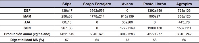 La producción de forraje promedio anual y por estación (promedio ± error estándar), y las digestibilidades para cada recurso forrajero se muestran en tabla 2 (Torres Carbonell, 2014).