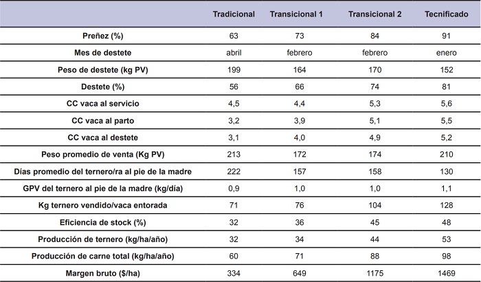 Los índices reproductivos y productivos se resumen en la tabla 3. La preñez aumentó desde Trad hasta Tecn. Acorde con el manejo del destete definido inicialmente, el peso del destete disminuyó de acuerdo a los días promedio al pie de la madre. Los kg de ternero vendidos por vaca entorada aumentaron a medida que se evolucionó en intensificación tecnológica, donde Tecn incrementó los kg de ternero vendido en un 80% con respecto al Trad.