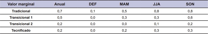 El análisis del VMA (tabla 4) permitió explorar la capacidad bioeconómica de repago estacional de cada planteo. En Trad, el mayor VMA fue durante JJA y SON posiblemente asociados con mejora de CC preservicio y por ende la preñez (Kunkle et al., 1994), además del aumento de peso de las vacas vacías incrementando la diferencia de inventario (resultados no mostrados). En el caso de Trans1 y Trans2, el mayor valor marginal se produjo con el suministro homogéneo anual y SON, asociados con una mejora en la CC de la vaca y por ende la preñez en el suministro anual, y SON asociados a un aumento en el peso de las vacas vacías incrementando la diferencia de inventario (resultados no mostrados) y destete. En el Tecn, el mayor valor fue en JJA y SON. En general, Trad y Trans1 lograron mayores valores de VMA con respecto a Trans2 y el Tecn, que podría asociarse a la oferta forrajera más diversificada (tabla 1) que equilibra la oferta forrajera estacional, menor carga animal y mejor productividad (ej. % de preñez, tabla 3).