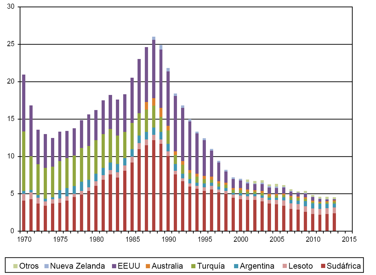 Con la reducción de la producción de mohair en Turquía, EE. UU. y Sudáfrica cobraron importancia relativa otros países productores. Argentina es ahora tercer productor mundial detrás de Sudáfrica y Lesoto cuya producción crece hace varios años. En Australasia y en algunos países del Asia Central la producción de mohair también tiene cierta importancia (Iñiguez et al., 2014). Sudáfrica tiene una participación algo mayor al 50% del comercio mundial de mohair por lo que los precios que obtiene ese país para las diferentes calidades son referencia de mercado. Es de notar en ese sentido la tendencia positiva que tienen los precios pagados al productor desde hace más de una década en ese país (figura 8). En parte la debilidad de la moneda de ese país frente al dólar de EE. UU. y al euro contribuyó al alza de los precios locales, pero la reducción de la oferta mundial de mohair y factores vinculados a la demanda han aumentado también fuertemente los precios en esas otras monedas.