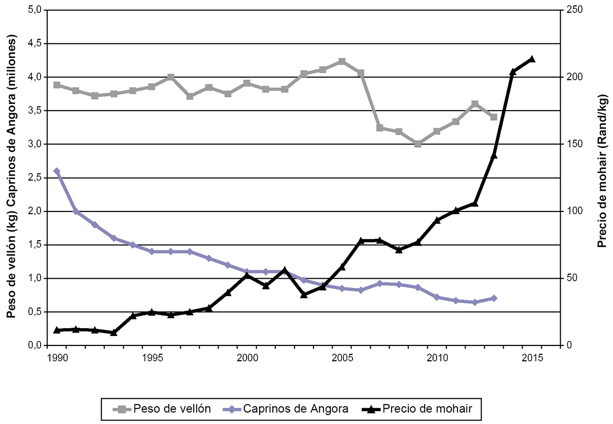 En Sudáfrica la reducción del stock de caprinos de Angora y producción de mohair coincide con la abolición del apartheid en 1991, que provocó cambios de orientación productiva en los establecimientos con Angora. Luego, en los años 2000 los precios de mohair fueron poco atractivos a lo que se sumó una sequía prolongada (2004 a 2009) que afectó al stock y los pesos de vellón en ese país. Turquía, que en los años 1960 contaba con más de 5 millones de cabezas, bajó su población Angora a menos de 160.000 y bajó su producción de mohair a unas 200 toneladas en el año 2012, la reducción en ese país se adjudicó a los bajos precios y una serie de factores internos (Kanturk Yigit, 2011; Dellal et al., 2014). En los EE. UU. el máximo stock de caprinos de Angora se registró en 1965 con 4,6 millones de cabezas y una producción de 14.300 toneladas de mohair. Hacia 1994 el stock bajó a 1,7 millones de cabezas, una reducción adjudicada fundamentalmente a la depredación (Scrivner, 1985). En 1995 se eliminaron los subsidios al productor de ovinos y caprinos en ese país y el proceso de reducción de stock se acentuó estabilizándose en 150.000 cabezas de esquila en los últimos años.