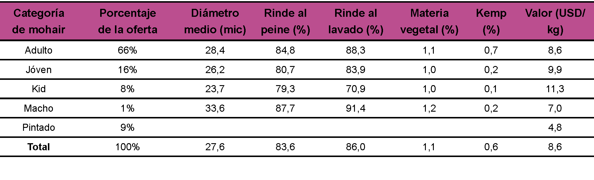 Así, en el mohair de varias organizaciones ofrecido recientemente para venta se observaron muy buenas finuras y bajos niveles de kemp en las diferentes categorías (tabla 2). El valor de venta promedio de ese mohair resultó 8,6 USD/kg cuando en la misma fecha las barracas ofrecían en promedio 4,7 USD/kg (Abad, 2015, informe no publicado). En esa fecha el indicador de precios al productor en Sudáfrica estaba en unos 14 USD/kg. Aunque en estos años solo el 10-15% del total de mohair comercializado se vendió bajo normas del Programa Mohair, se supone que los precios logrados en los remates arrastraron los precios pagados a vendedores individuales.