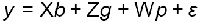 donde y es el vector de datos, b es el vector de los efectos de bloques (asumidos como fijos) y sumados a la media general, g es el vector de los efectos genotípicos de los orígenes (asumidos como aleatorios), p es el vector de los efectos de parcela y e, el vector de los residuos (aleatorios). X, Z y W representan las respectivas matrices de incidencia.