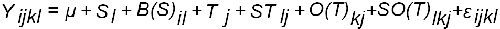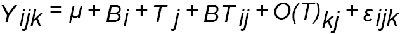 donde m es la media general; Bi, el efecto de bloques; Tj, el efecto de taxones; BTij, la interacción bloques por taxones; O(T)kj, el efecto de orígenes dentro de taxones y e ijk corresponden a los residuos aleatorios.