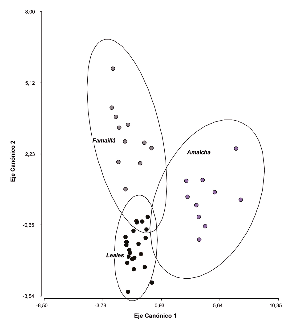 Con el objeto de lograr una representación de las observaciones en el espacio donde las diferencias entre los grupos sean maximizadas se realizó un análisis discriminante sobre las variables estudiadas con respecto a la localidad de origen, considerada como variable de clasificación.
