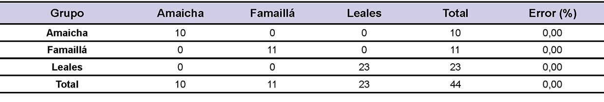 En cada una de las pruebas se realizó la tabla de clasificación cruzada (tabla 5) que permite identificar datos outliers o mal clasificados, encontrando que en todos los casos resultó ser cero la tasa de error aparente.