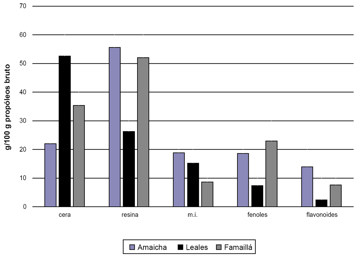 Por otro lado, contrastando con los requisitos establecidos en el CAA para propóleos bruto, se observa que los de Amaicha los satisfacen totalmente, no así los de Leales y parcialmente los de Famaillá, debido a valores elevados de cera y bajos de resinas. No obstante, los contenidos de fenoles y flavonoides totales superaron en todos los casos los requisitos mínimos, por lo que pueden ser aprovechados tanto como propóleos en bruto como transformados en extractos u otros productos de mayor valor agregado.