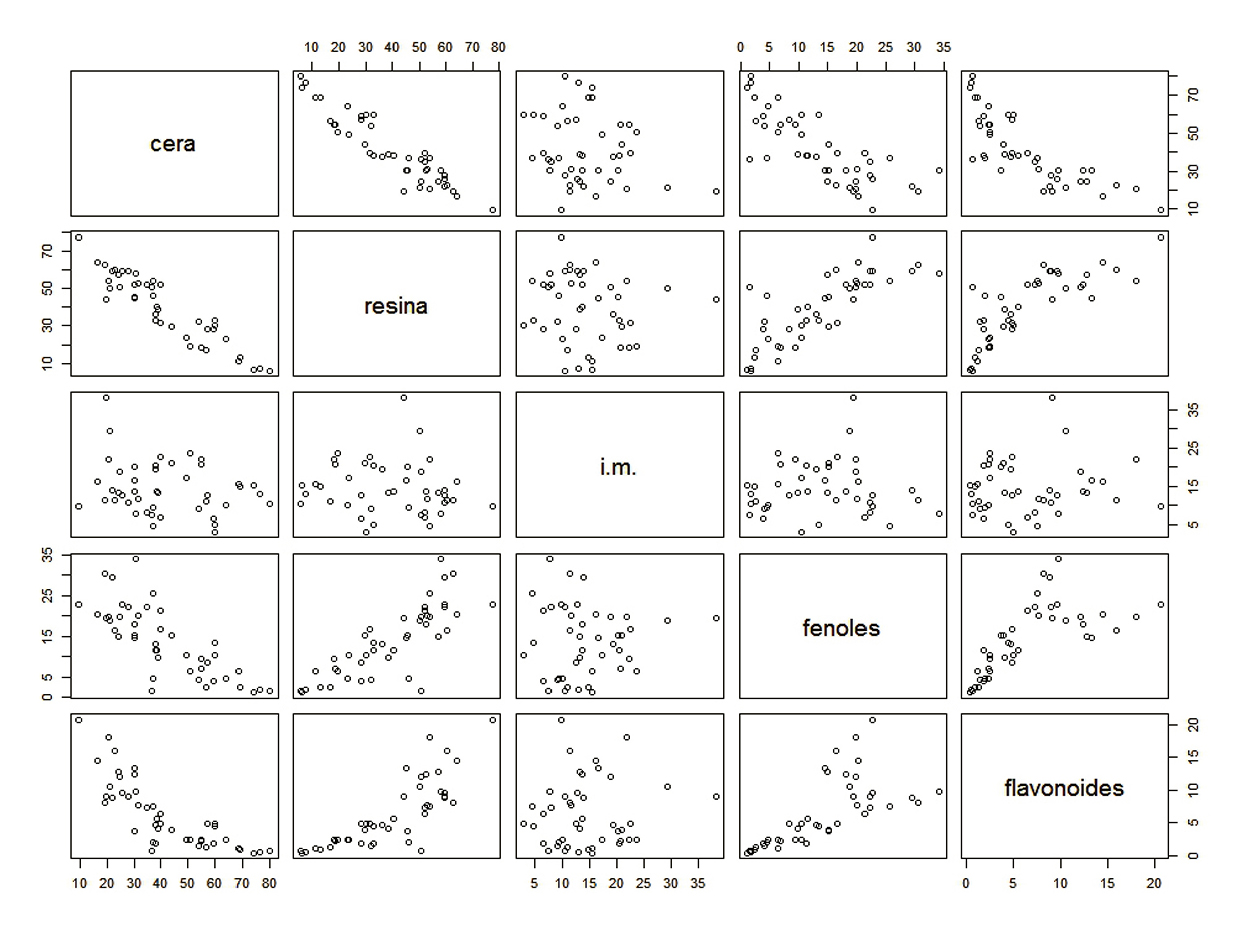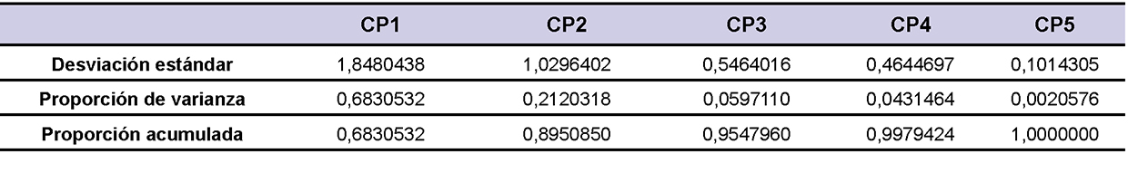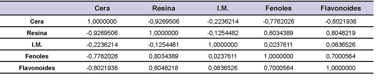 Como se observa en la figura 2 y en la tabla 1, se obtuvieron altas correlaciones entre los parámetros: cera, resina, fenoles, flavonoides y bajas entre impurezas mecánicas y los demás parámetros. El análisis de componentes principales explicó el 89% de la varianza total de los parámetros físicoquímicos con dos componentes (CP) (tabla 2).