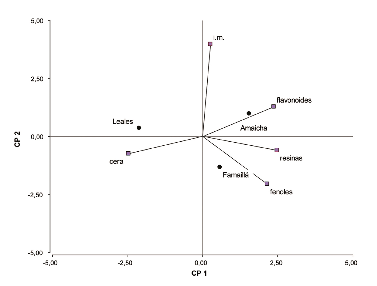 CP1 explicó el 68% de la varianza y estuvo asociado fuertemente al contenido de cera y resinas, pero en direcciones opuestas (figura 3), por lo que opondrá localidades de procedencia donde sus propóleos muestren mayores valores de ceras y resinas, en este caso Leales y Famaillá. CP2 aportó el 21% restante de la varianza total y estuvo muy asociado al contenido de impurezas mecánicas. La ortogonalidad de las CP garantiza que CP2 nos provea la información que explica la variabilidad entre los contenidos de fenoles, resinas y flavonoides entre Famaillá y Amaicha que no es explicada por CP1.