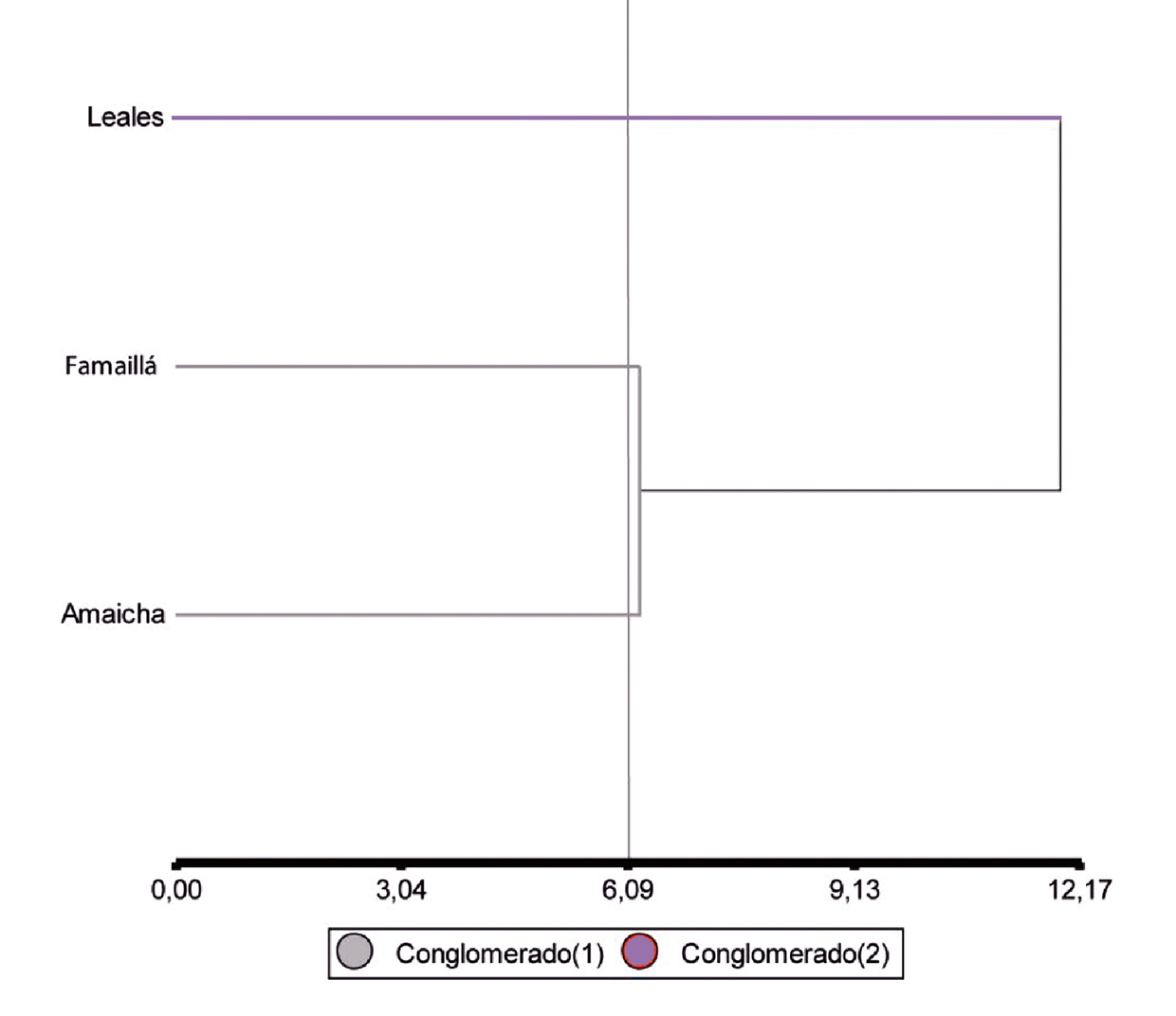 Se observa que los propóleos de Leales se separan del resto formando un grupo (figura 4). Famaillá y Amaicha conforman otro grupo.