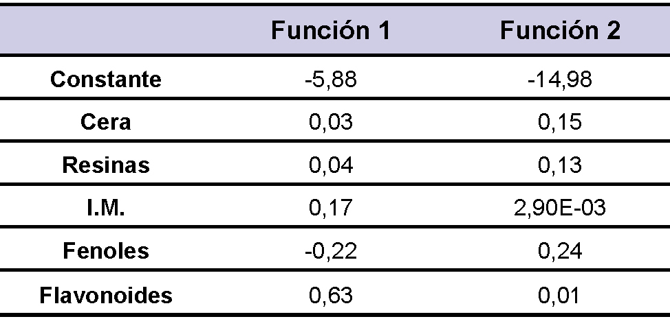 Se utilizaron dos funciones para el análisis, donde los coeficientes de ponderación corresponden a los coeficientes de las funciones canónicas discriminantes que se presentan a continuación: