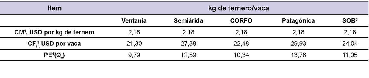 El PE de la técnica para cada subregión del SOB, obtenido a partir de la ecuación Qx, indica los kilogramos de ternero por vaca que se deberían producir por sobre los actuales para cubrir los costos fijos directos de la amonificación y obtener al menos el mismo resultado que antes de incorporar la nueva tecnología (tabla 1).