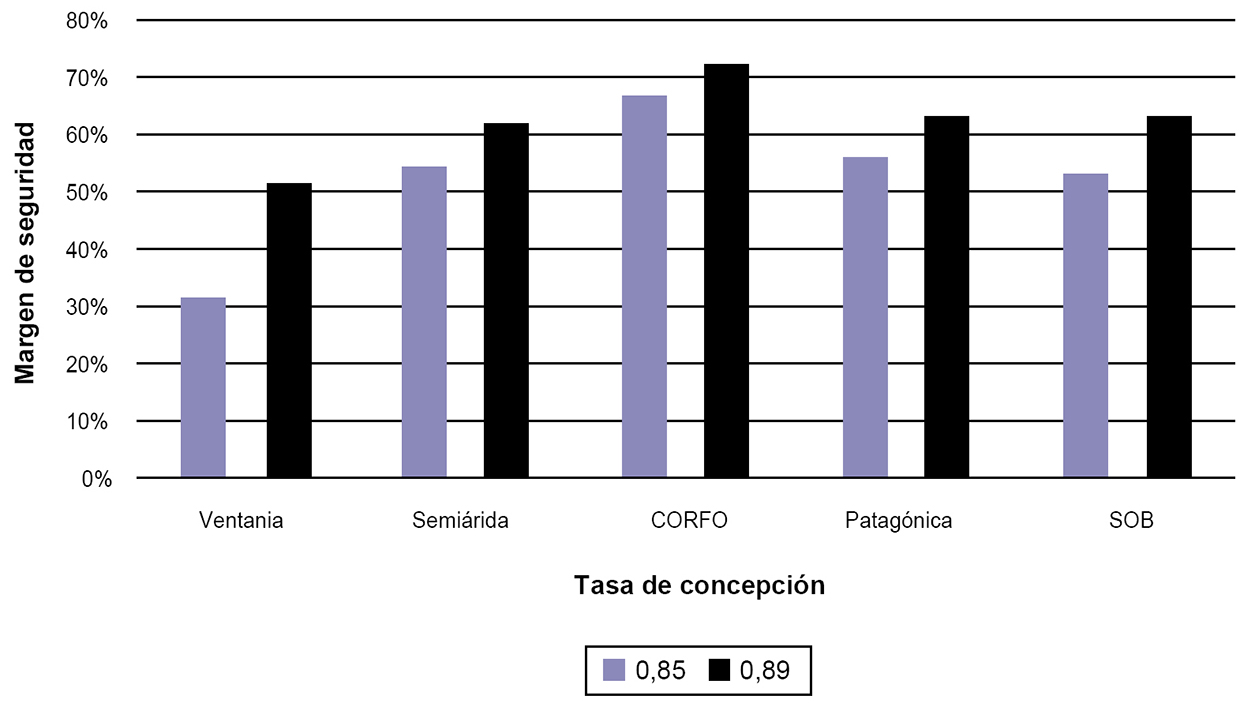 Se observa que con una tasa de concepción del 85% todas las subregiones están produciendo por sobre su punto de equilibrio con un MS mayor al 32%. Alcanzando un 89% de concepción el MS sube a 52% variando entre subregiones (figura 3).