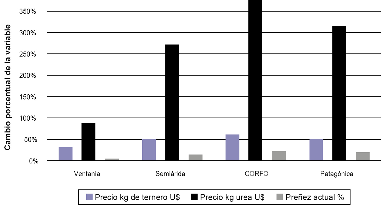 Mediante un segundo análisis de sensibilidad se analizó el grado en que cada variable afecta los resultados. Se utilizaron como variables claves el precio del kilogramo de ternero, la tasa de concepción inicial y el precio del kilogramo de urea.