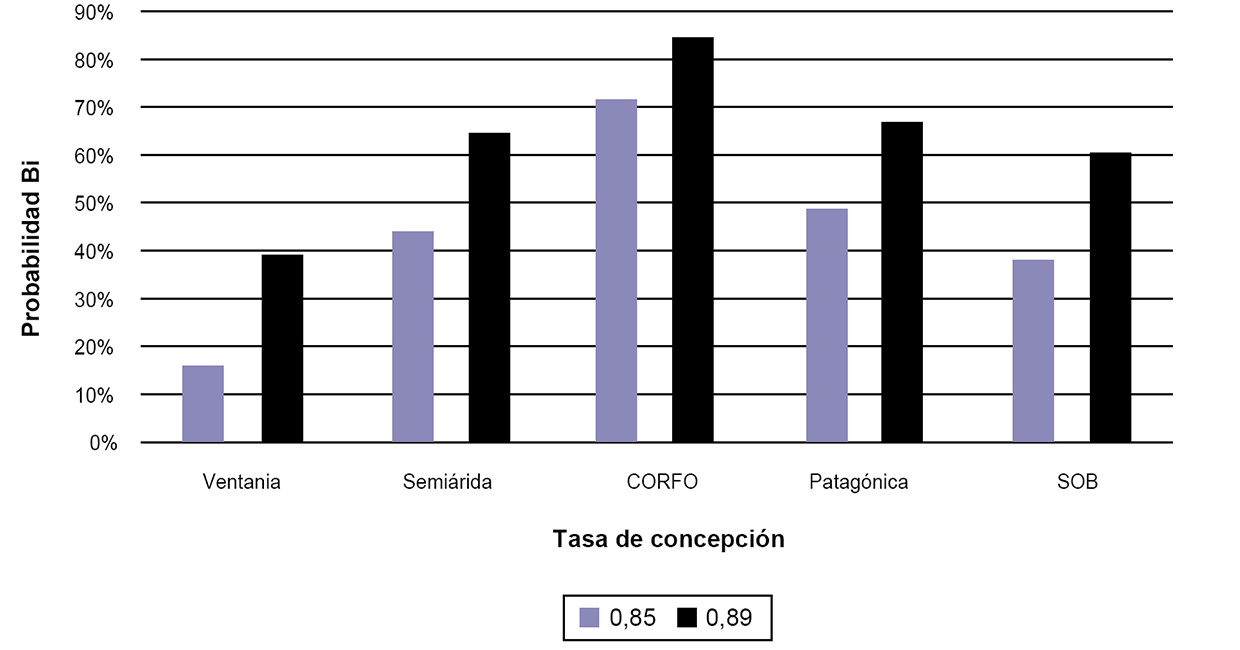 Comparando las distintas subregiones, se observa que en la subregión CORFO existe la mayor probabilidad de obtener un Bi mayor a cero con la incorporación de rollos de paja de trigo amonificados. La subregión Ventania es en la que se encuentra menos probabilidad de obtener Bi positivos. Para el resto de las subregiones y para el SOB, si la técnica logra una tasa de concepción del 89%, la probabilidad de obtener un Bi positivo es mayor al 60% (figura 5).