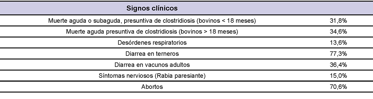 Por otro lado, en el caso de vacunos adultos el 34,6% de los propietarios comunicaron casos de muertes agudas, con animales mostrando sangre en el ano, boca u ollares, los cuales fueron diagnosticados presuntamente como carbunco, pero sin una confirmación sobre la presencia de Bacillus anthracis.