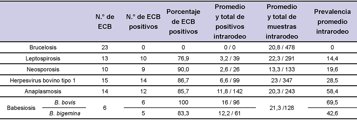 En la tabla 2 se presentan los agentes etiológicos estudiados y su reactividad en los ECB encuestados y las seroprevalencias medias intrarodeo.