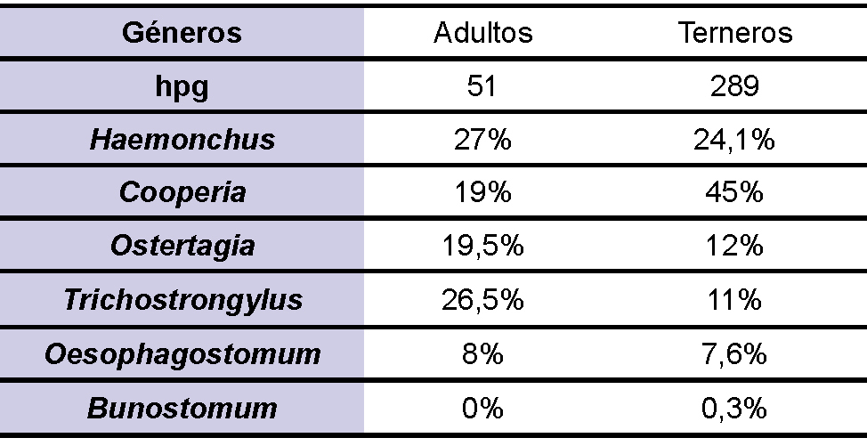 En lo que a parasitosis internas se refiere, el promedio de los conteos de huevos de nematodes por gramo (hpg) fue de 51±56 para los animales adultos y 289±187 para los terneros/as, con valores extremos de 120 y 710 hpg respectivamente. Es conveniente tener en cuenta que la época de visita, muestreo y las probables desparasitaciones declaradas no fueron las mismas para todos los ECB y que, en muchos casos, los hpg podrían verse disminuidos por tratamientos previos no comunicados con exactitud. En algunos de los hpg se observaron también huevos de Trichuris y de Moniezia. Los porcentajes promedios de los géneros de nematodes diferenciados están esquematizados en la tabla 3, observándose que Cooperia, Haemonchus, Ostertagia y Trichostrongylus fueron los géneros de nematodes prevalentes. Según declaraciones de los propietarios, en un 69,6% de los ECB se registraron, a fines de verano y principios de otoño, terneros con signos clínicos compatibles con gastroenteritis verminosa (GEV) y según ellos similares a las fotos de animales de esa edad con GEV que se les mostraba. Los signos descriptos fueron desmejoramiento, diarrea oscura, pelaje hirsuto, decolorado y edema submandibular; los casos tratados con antihelmínticos mejoraban. A partir de un ternero muerto por rabia paresiante, durante la necropsia se recuperaron los siguientes nematodes: 1200 Haemonchus placei 15000 Trichostrongylus axei, 4000 Ostertagia ostertagi y 2000 Cooperia sp. Además, la importancia de los nematodes bovinos para el ganado local tiene antecedentes en el caso descripto por Micheloud et al. (2014) y los resultados de estudios previos realizados por Suárez et al. (2017a) en esta región. Este último estudio muestra mermas de hasta el 60% sobre la ganancia de peso de la recría y en la necesidad de utilizar el hpg como método de monitoreo diagnóstico en el otoño para prevenir la elevación de las cargas parasitarias hacia el final del otoño-principios de invierno y monitorearlas durante el período estival.