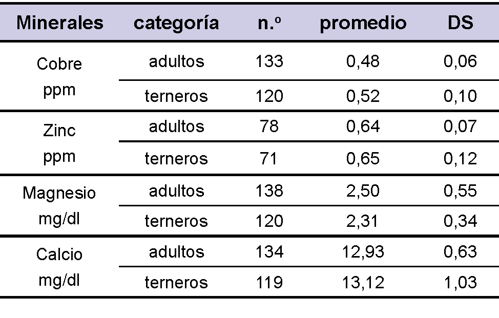 Los valores promedios de cobre, zinc, magnesio y calcio séricos diferenciados en bovinos adultos (mayormente vacas) y terneros están señalados en la tabla 4. Se muestran cifras dentro de los parámetros normales tanto para el magnesio y como para el calcio, mientras que señala valores límites o de deficiencia leve para el cobre y el zinc.