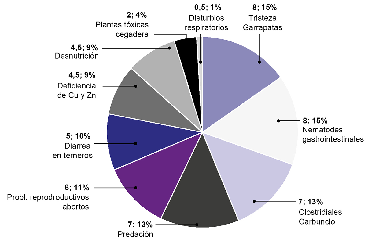 A partir de las afirmaciones de quienes estaban a cargo del ganado vacuno, sobre cuáles eran, según su entender, los principales inconvenientes de salud de sus animales, sumadas a lo observado, registrado y analizado por nuestro equipo de trabajo, señalamos los problemas sanitarios destacados que surgen de esta encuesta (figura 2).