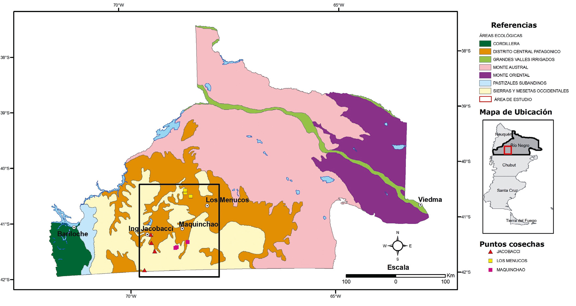 El estudio se llevó a cabo en la provincia de Río Negro en un área que comprende a las localidades de Los Menucos, Maquinchao e Ingeniero Jacobacci. El área abarcada es ambientalmente caracterizada como de transición entre las áreas ecológicas de sierras y mesetas occidentales y monte austral (figura 1). En dicha región, histórica y frecuentemente, se presentan casos de intoxicación por Astragalus pehuenches en el ganado. Para los fines del estudio el área se subdividió en tres zonas comprendiendo establecimientos ganaderos aledaños a las tres localidades antes citadas.