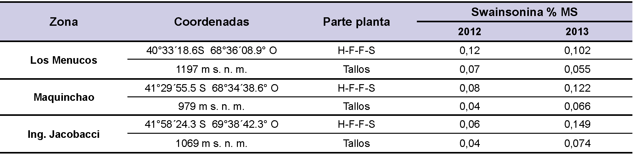 En la tabla 1 se pueden observar los detalles de cosechas y los valores de swainsonina a nivel regional para los dos años de estudio.