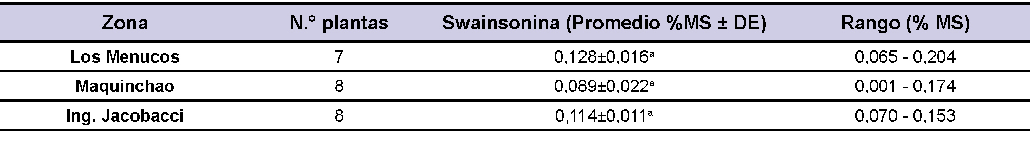 Los promedios zonales, el desvío estándar y el rango de la concentración de swainsonina en los especímenes cosechados en el muestreo sistemático se presentan en la tabla 2. Las concentraciones de swainsonina no difirieron significativamente según zona de cosecha (p=0,277).