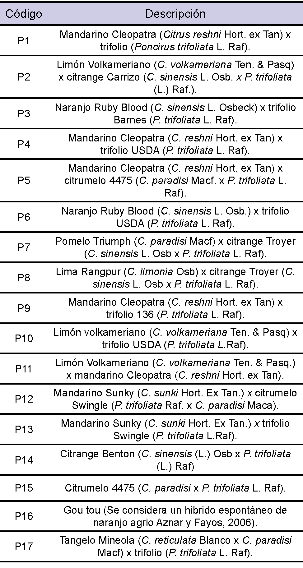 Los tratamientos probados consistieron en combinaciones de naranjo dulce [Citrus sinensis (L) Osbeck] ‘Valencia Late’ cv Limeira, sobre 17 portainjertos y se describen en la tabla 1. Fueron conducidos en un diseño completamente aleatorizado con seis repeticiones de una planta por parcela.