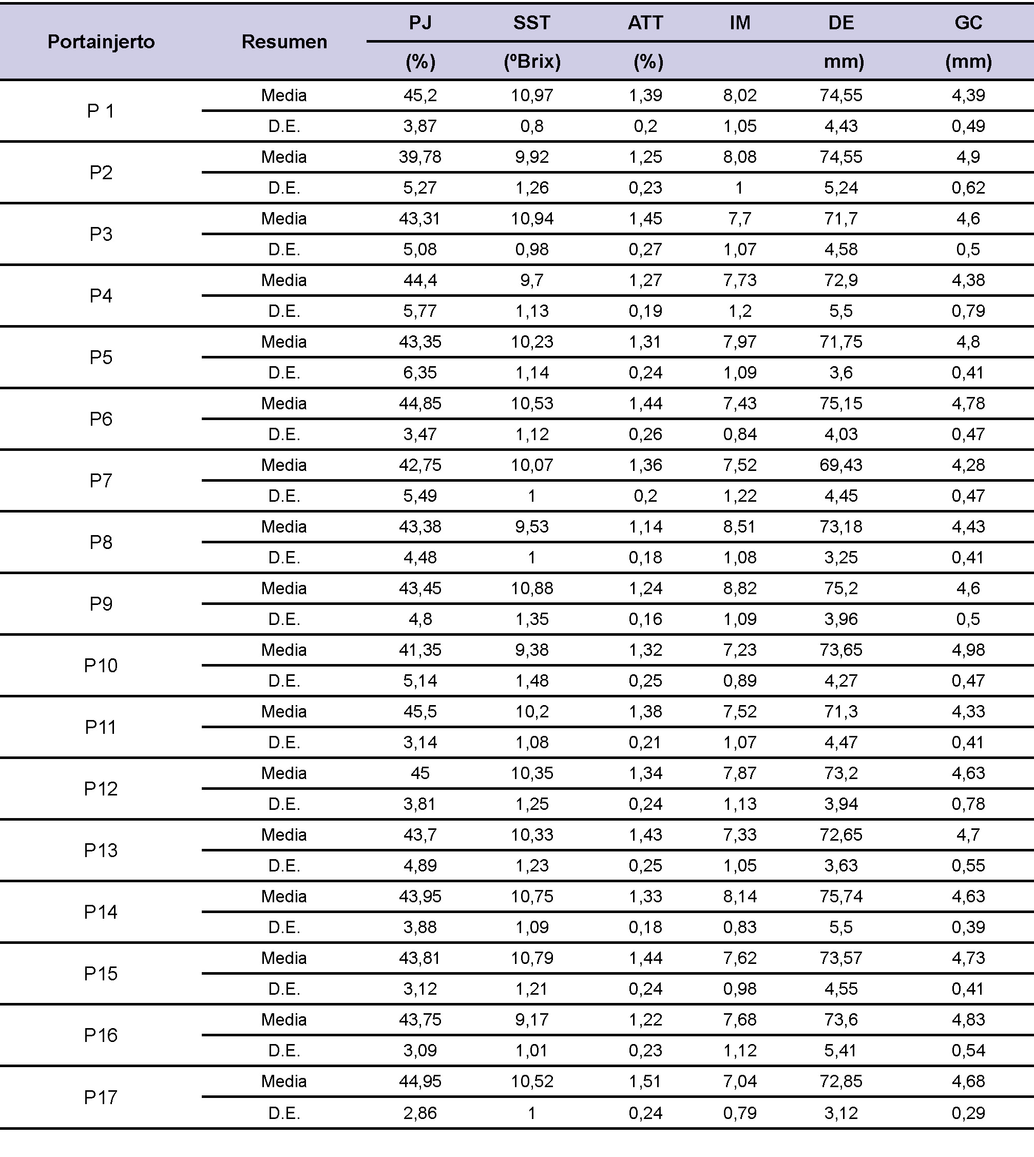 Los portainjertos P1, P11 y P12 tuvieron los mayores valores de PJ mientras que los menores valores mostraron P2 y P10. Los portainjertos P1 y P3 presentaron valores altos de SST. En cuanto a la ATT los valores más altos se observaron en los portainjertos el P17, P15, P13, P6 y P3. Respecto del IM, los valores más altos se observaron en P9 y P8 y los más bajos en P17 y P10. La variable DE obtuvo valores altos en P14, P9 y P6 y respecto del GC los mayores valores se observaron en P10, P2 y P16.