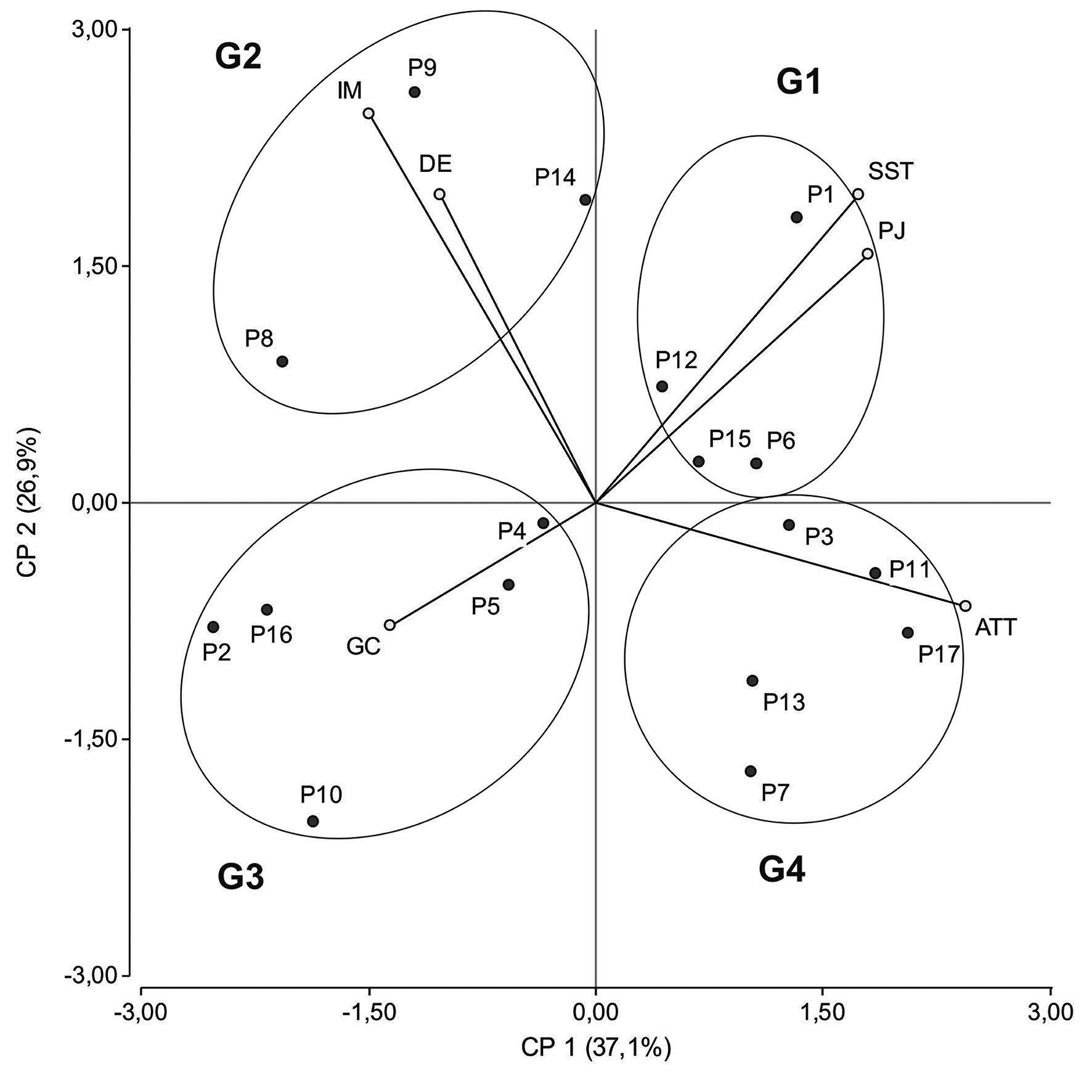 De acuerdo con los valores absolutos de los coeficientes que ponderan cada una de las variables, se observa que ATT, PJ y SST contribuyen de manera importante en la definición de la CP1.