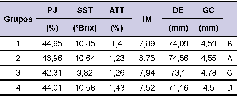 G3: está constituido por los portainjertos híbridos P2, P4, P5, P10 y P16. Los frutos de este grupo se caracterizan por poseer los mayores grosores de cáscara, los menores valores de porcentajes de jugo, sólidos solubles totales, y valores intermedios para acidez total titulable, índice de madurez y diámetro ecuatorial. (Monteverde et al., 2005) encontraron para naranjo ‘Washington Navel’ mayores porcentajes de jugo, sólidos solubles totales, índices de madurez y diámetros ecuatoriales, pero menor acidez total titulable en las plantas injertadas sobre lima ‘Rangpur’ y mandarino ‘Cleopatra’.