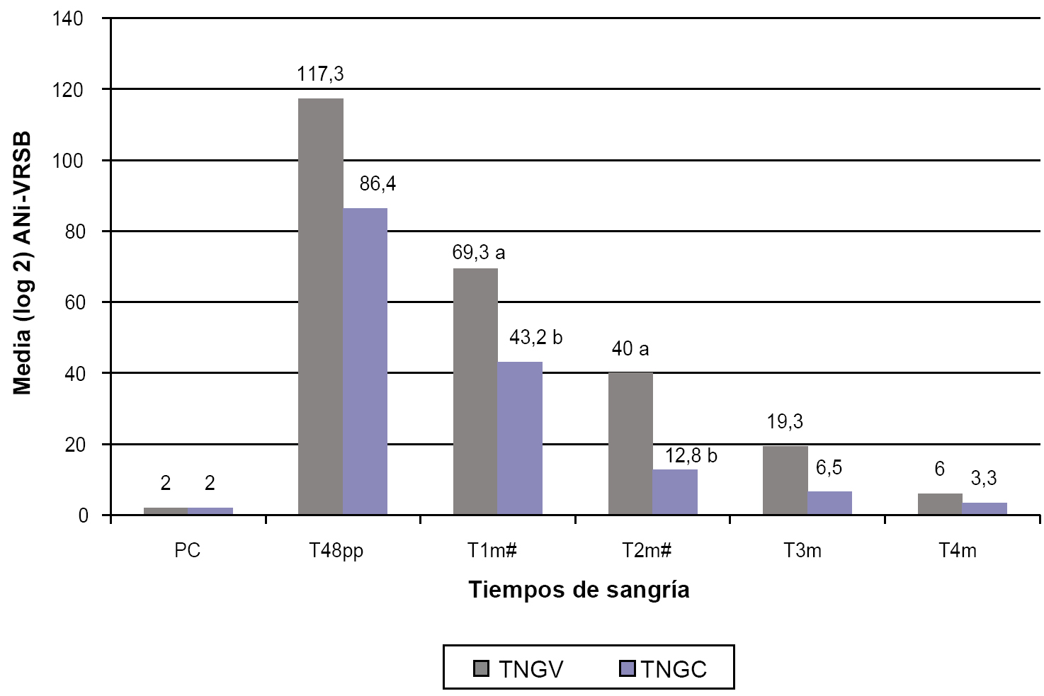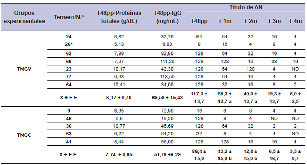 Los niveles de proteínas totales e inmunoglobulinas G total a las 48 horas posparto y de AN anti-VRSB en los distintos tiempos de sangría de los terneros nacidos de ambos grupos, se muestran en la tabla 2. No se encontraron diferencias significativas en los niveles de proteínas totales e IgG entre ambos grupos de terneros: terneros nacidos del GV (TNGV) y terneros nacidos de GC (TNGC). Es importante mencionar que las diferencias observadas en los títulos de anticuerpos entre los terneros número 24 y 26 se debieron a una falla en la transferencia pasiva de anticuerpos (FTPA) en el ternero número 26.