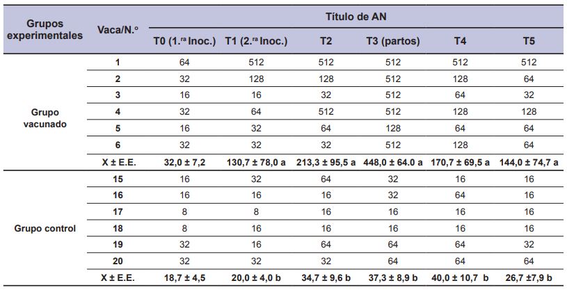 El estado corporal de todas las vacas durante el periodo de ensayo estuvo comprendido entre 3,5 y 4 de score (datos no presentados en los resultados). Los resultados de SN viral en las vacas se muestran en la tabla 1. SSe consideró que un animal seroconvirtió cuando el título de AN había variado en un total de 2 diluciones base 4. Todas las vacas del grupo vacunado seroconvirtieron 60 días posteriores a la segunda vacunación (p<0,05). Los títulos de anticuerpos alcanzaron niveles máximos 90 días después de la primera vacunación y luego comenzaron a disminuir. Sin embargo, la mayoría de los animales presentaron altos títulos (>128) de anticuerpos al día 210. Ninguno de los animales del grupo control seroconvirtió durante el ensayo (p> 0,05), presentado niveles basales (8-64) de anticuerpos neutralizantes durante toda la experiencia.