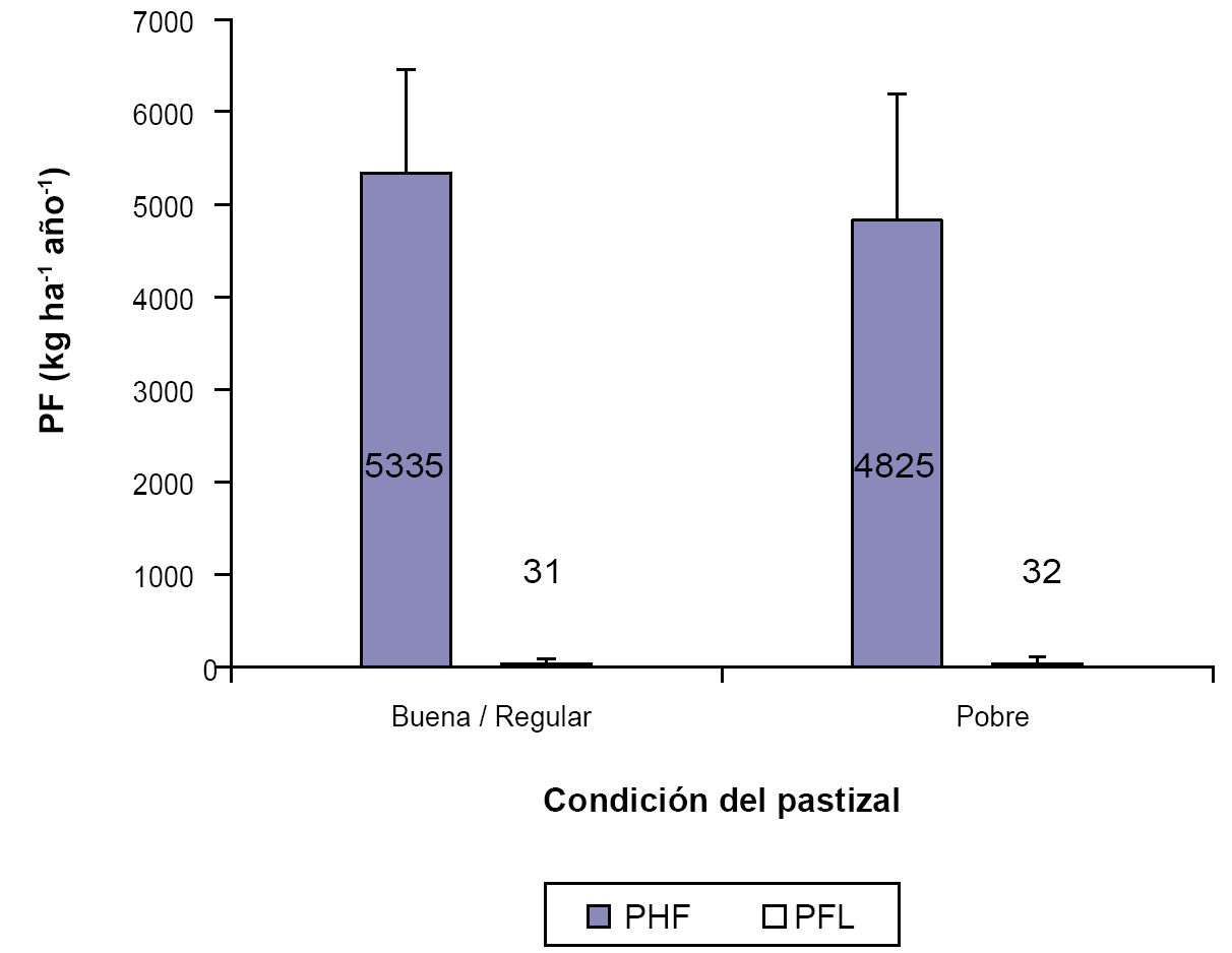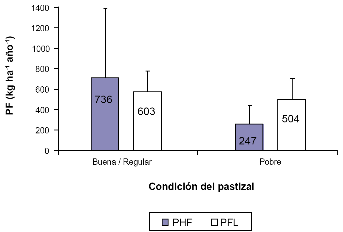 Contraste de la productividad forrajera herbácea (PFH) y leñosa (PFL) de 13 pares de sitios de condición regular - buena versus condición pobre (apareados), en el extremo seco del distrito occidental de la provincia fitogeográfica chaqueña en La Rioja. Las líneas negras verticales encima de las barras indican 1 desvío estándar.