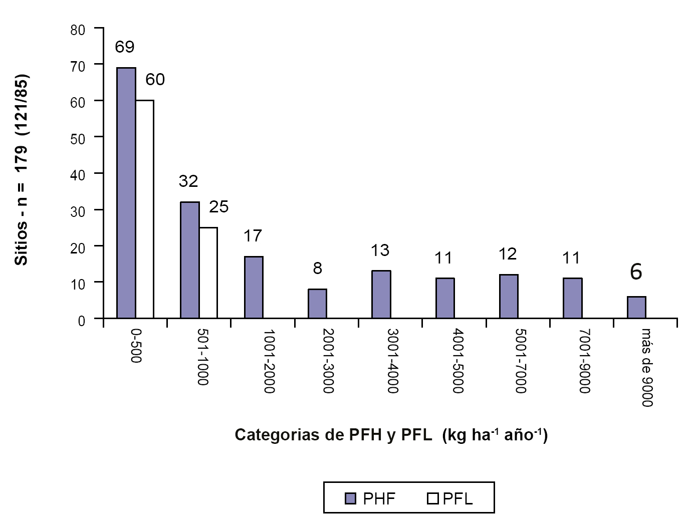 Distribución de los 179 sitios de monitoreo (cantidad) en clases de la productividad forrajera herbácea (PFH, barras oscuras) y leñosa (PFL, barras claras), de los cuales 121 tenían vegetación herbácea y leñosa, pero solo en 85 se estimó PFL.