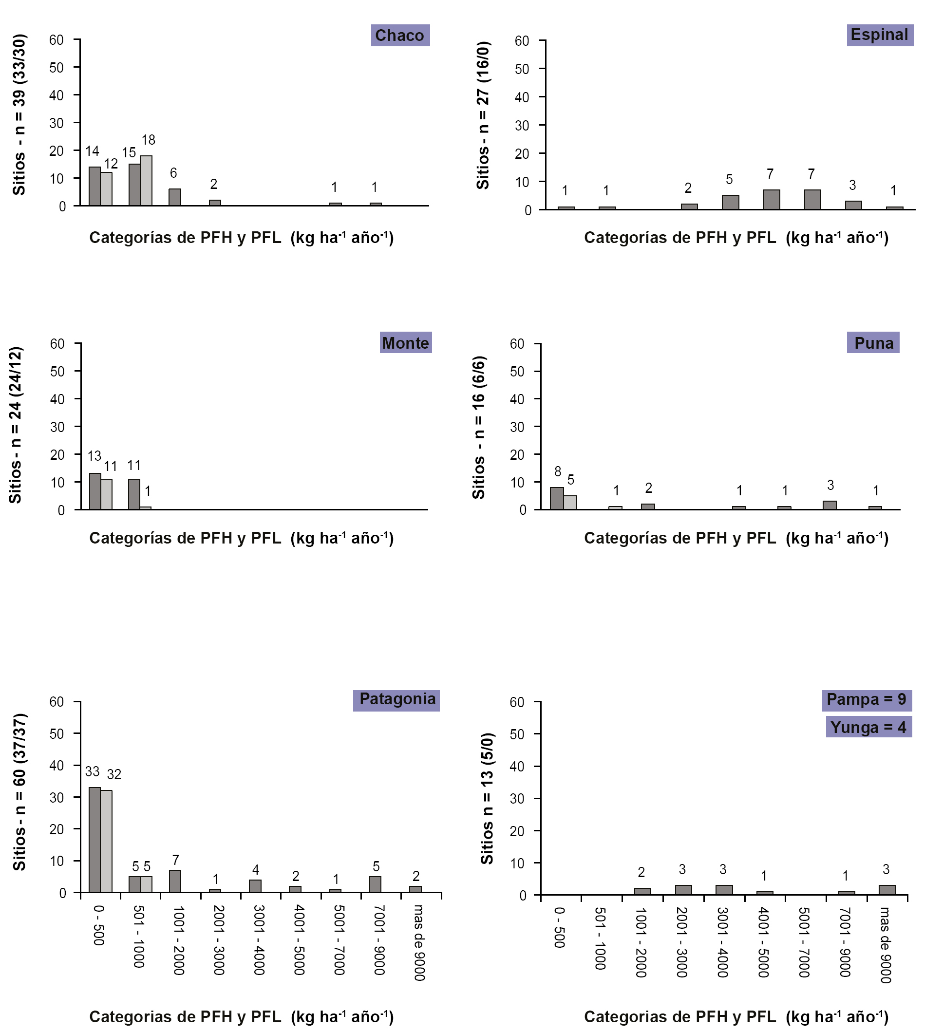 En la provincia fitogeográfica Chaqueña, la mayor distribución de sitios con PFH y PFL menores a 1.000 kg ha-1 año-1, se debe a que sitios con mayor potencial productivo en la región (porción oriental del distrito occidental, distrito serrano y distrito oriental) fueron menos evaluados; y además en ellos solo se estimó PFH.