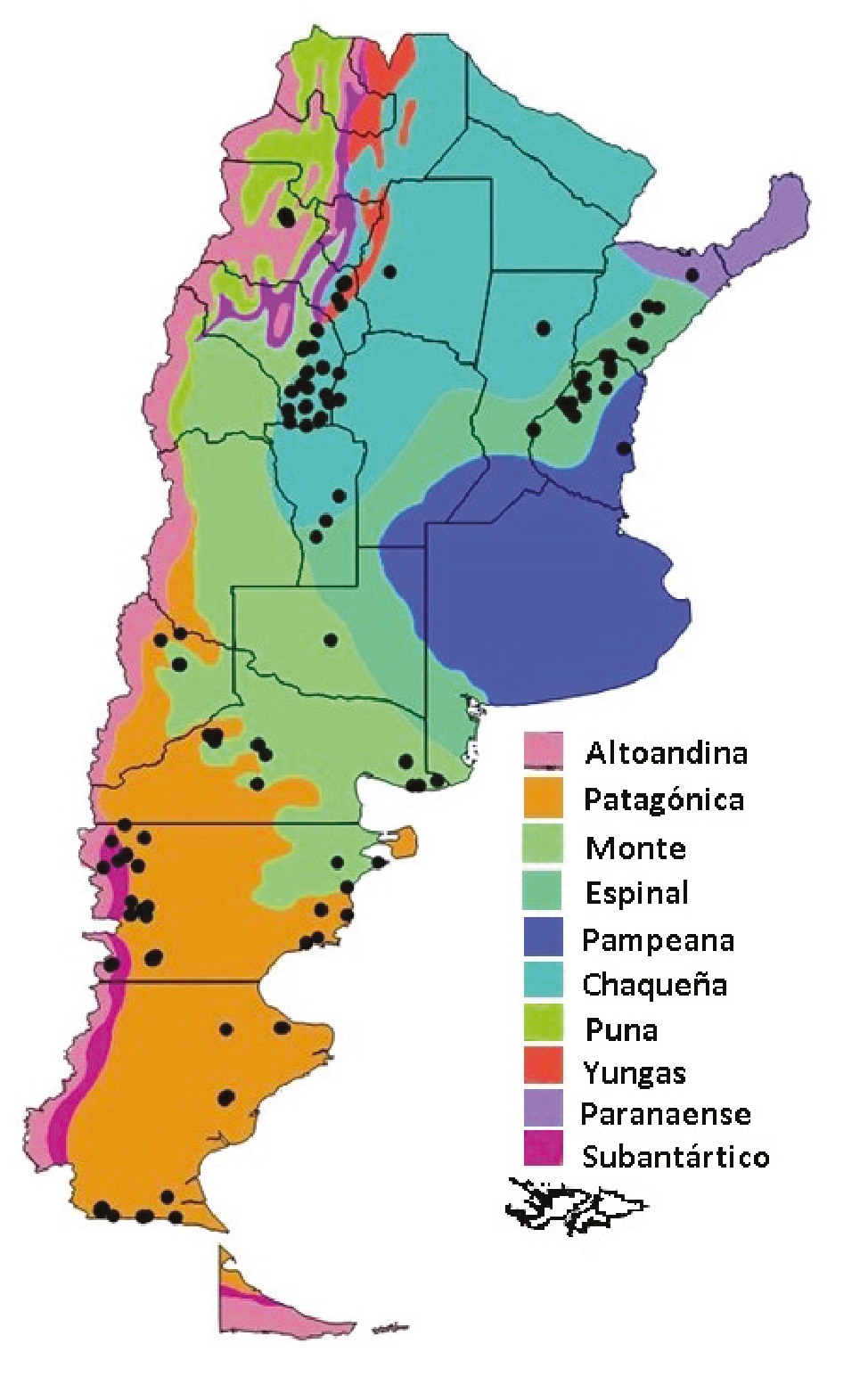 Distribución geográfica de los 179 sitios de monitoreo de la productividad forrajera (PF, círculos), en relación con las provincias fitogeográficas de Argentina (Cabrera, 1976).