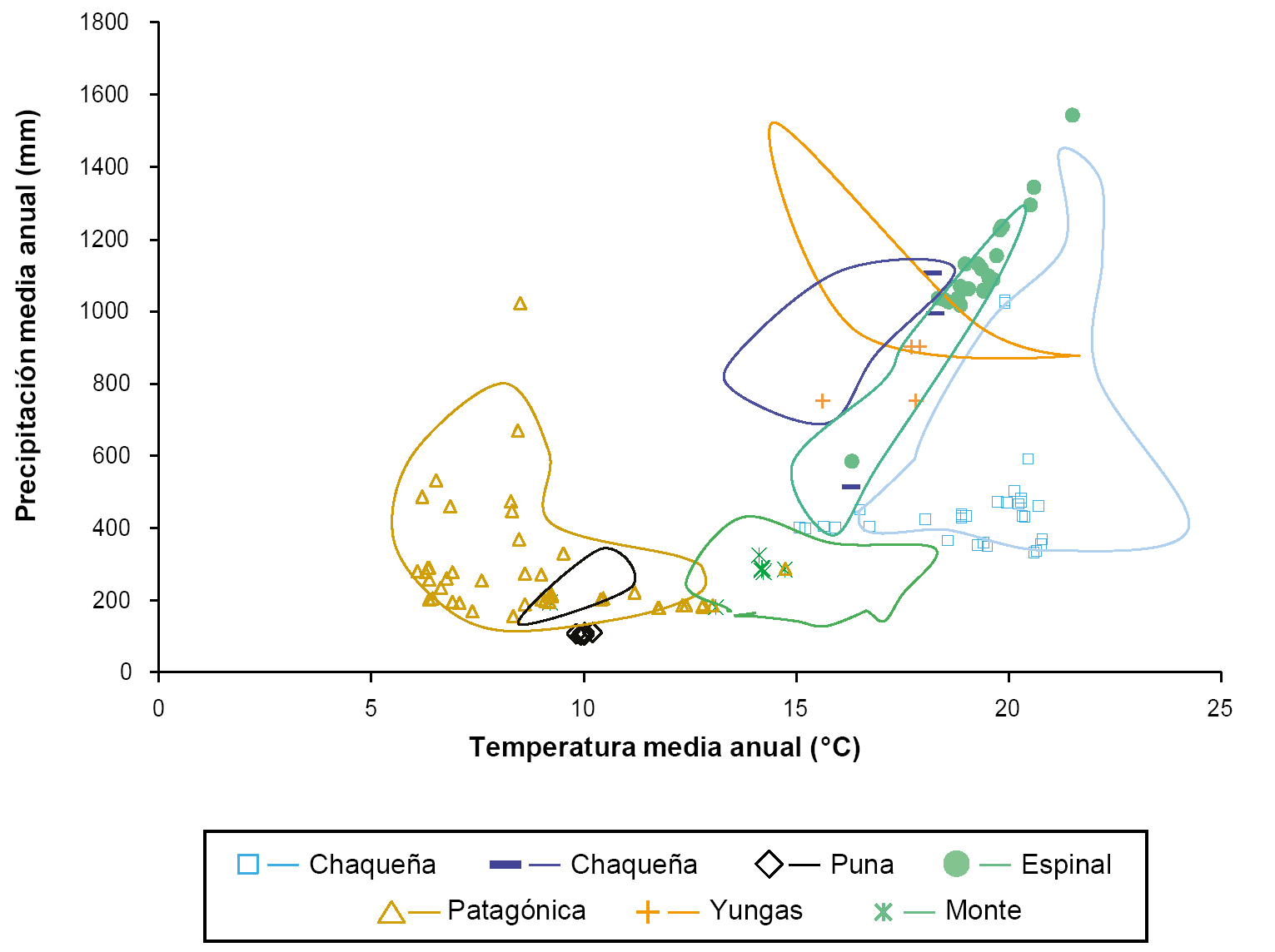 Distribución climática de los sitios de monitoreo de la productividad forrajera (símbolos) en relación con los límites climáticos de las provincias fitogeográficas (Cabrera, 1976) a las que pertenecen (áreas irregulares). La distribución climática de los sitios de monitoreo se generó a partir de la precipitación media anual (PMA, obtenida de datos de pluviómetro cercanos) y de la temperatura media anual (TMA, obtenida de la página web de Global Climate data (http://www.worldclim.org/bioclim). Los límites climáticos de las provincias fitogeográficas se construyeron uniendo los valores de PMA y TMA obtenidos de los diagramas climáticos presentados por Cabrera (1976) para caracterizar las provincias fitogeográficas.