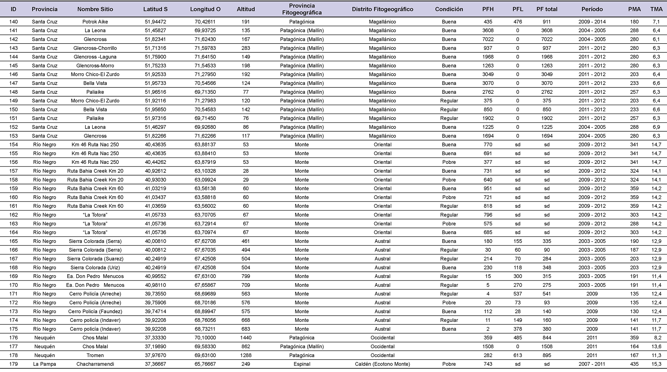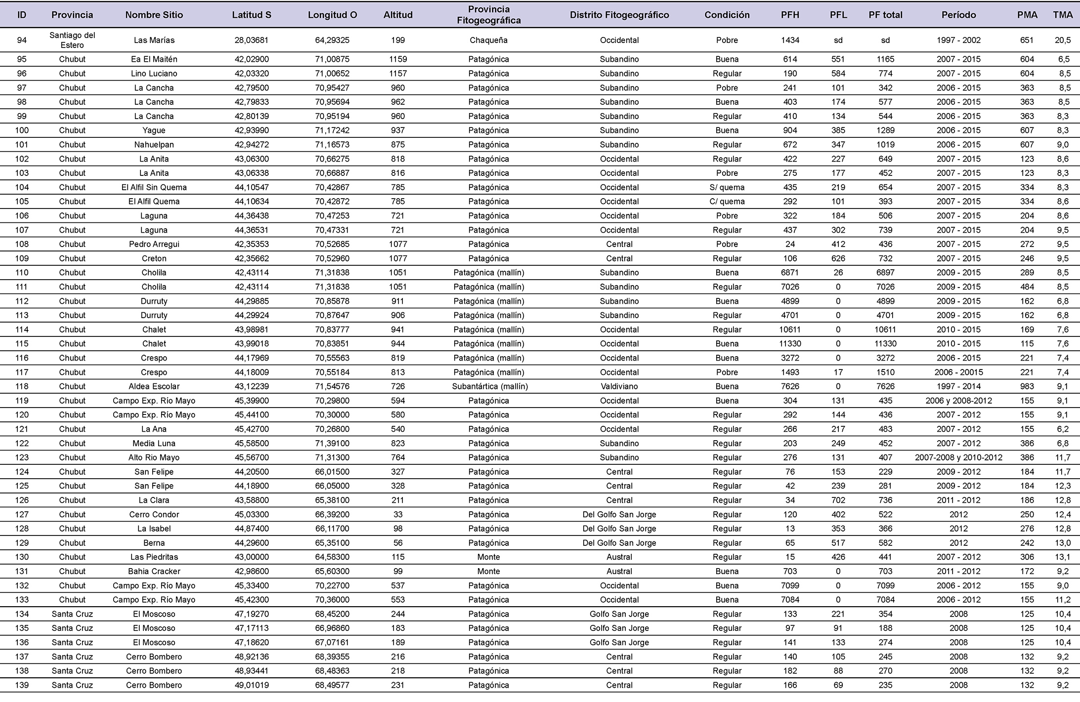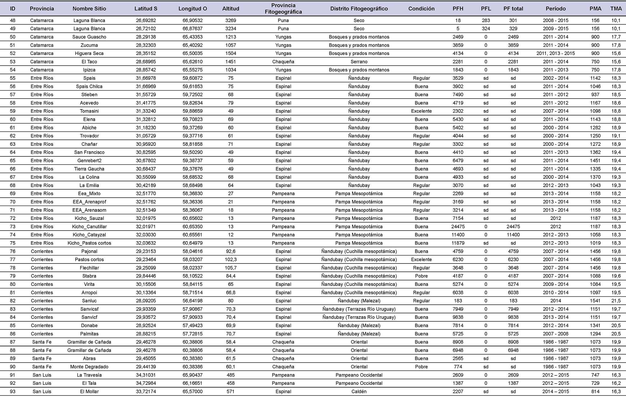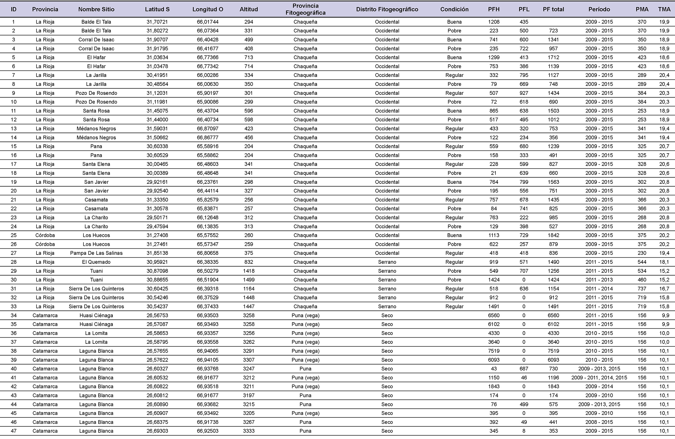 Caracterización de los sitios incluidos en la red de monitoreo forrajero. Incluye la ubicación geográfica (grados), la altitud (m), la identidad florística – fisonómica (provincia y distrito fitogeográfico según Cabrera, 1976), la condición ecológica, la producción forrajera herbácea (PFH), leñosa (PFL) y total (PFH + PFL) expresadas en kg ha-1 año -1, el período para el cual se promediaron los datos de PFH y PFL, la precipitación media anual (PMA en mm, estimada a partir de pluviómetros ubicados en los sitios de estudio, excepto en aquellos sitios sin pluviómetro para los cuales se extrajo el dato desde la base de datos de Global Climate data (http://www.worldclim.org/bioclim) y la temperatura media anual (TMA en ºC obtenida desde la base de datos Global Climate data (http://www.worldclim.org/bioclim).