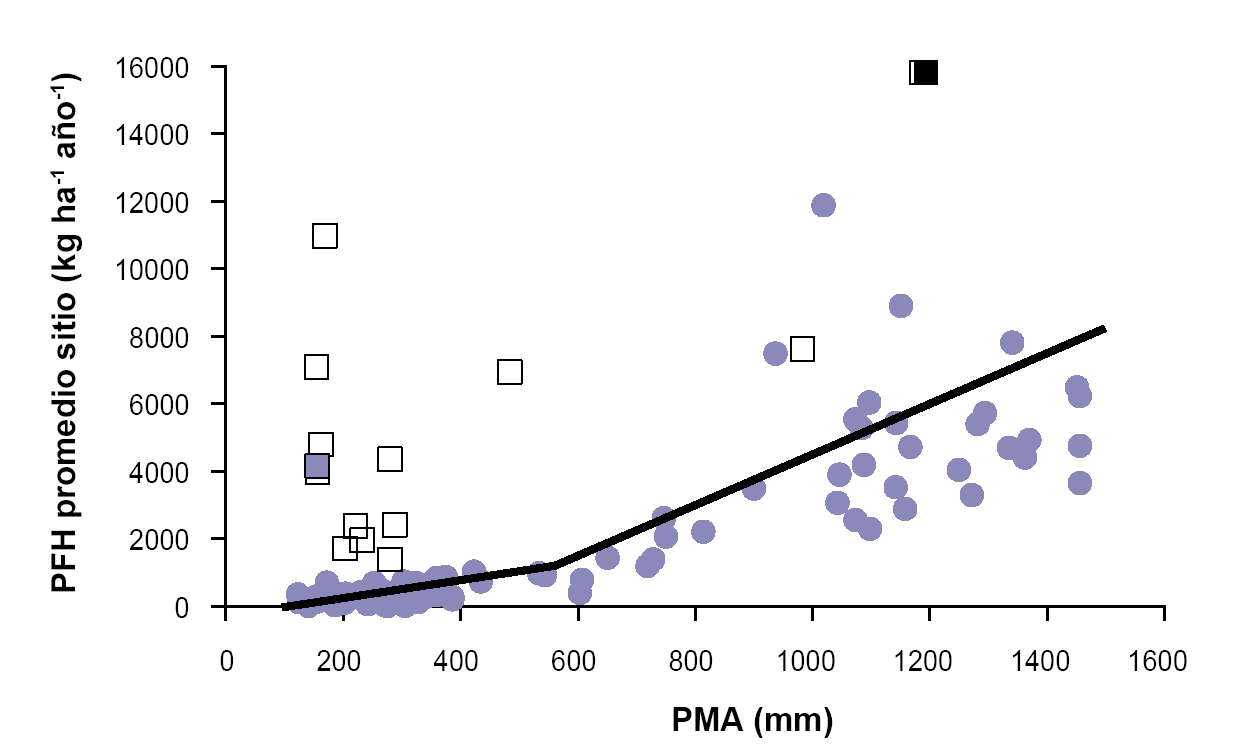 Particularmente, los valores de PPNA que se obtienen con el modelo de Lauenroth (1979) en los extremos de PMA (100 mm y 1.500 mm) son similares a los valores de PFH que se obtienen utilizando el modelo con punto de quiebre mostrado en este trabajo. Sin embargo, para valores intermedios de PMA las estimaciones de nuestro modelo con punto de quiebre y el modelo lineal de Lauenroth (1979) son sensiblemente diferentes. En nuestro modelo solo se contempla la fracción herbácea de la productividad primaria, y en los ecosistemas más xéricos (PMA < 540 mm) la mayor proporción de la PF es esperable que sea leñosa (Paruelo y Lauenroth, 1996), especialmente en ambientes degradados. Probablemente, esta parcialidad en el análisis de la PPNA sea determinante para que en nuestro modelo la pendiente para sitios con PMA superiores a 540 mm sea el triple a la de sitios con PMA menores a 540 mm.