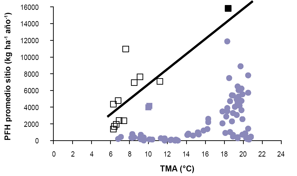 Relación entre la productividad forrajera herbácea (PFH) de cada sitio de muestreo (promediando todas las condiciones) y la temperatura media anual (TMA). Círculos grises corresponden a todos aquellos sitios que no son humedales. Los cuadrados vacíos corresponden a mallines Patagónicos, el cuadrado negro corresponde a humedales de islas del Delta del río Paraná y ese cuadrado no es gris a vegas de la Puna. La relación entre PFH de humedales y TMA (línea negra) se estimó mediante regresión lineal simple (PFH = 1001 TMA – 3286; r2 = 0,6229, para 6 ºC < TMA < 22 ºC ).