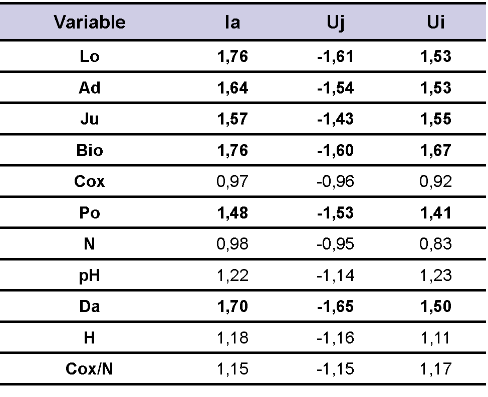Los datos de las tres profundidades se promediaron para conseguir un único valor de 0 a 30 cm. El análisis espacial se hizo utilizando el sistema Spatial Analysis by Distance Indices (SADIE) propuesto por Perry et al. (1996). La metodología cuantifica el patrón espacial de la variable objeto de estudio, detecta los agregados locales de la variable y cuantifica el grado de asociación o disociación espacial entre pares de variables; genera estadísticos continuos para cada punto de muestreo, con lo que las diferentes facetas del patrón espacial que SADIE detecta, pueden ser representadas mediante mapas (Quero, 2006). Los índices obtenidos con SADIE son: el índice de agregación (Ia), índice de agrupación (Uij), y asociación global (Χ ). Por una parte, Perry et al. (1996) establecen que valores de Ia > 1 indican un patrón agregado, Ia < 1 patrón regular y Ia = 1 patrones aleatorios. Por otra parte, valores de υ mayores de 1,5 (Ui) o menores de -1,5 (Uj) advierten sobre la presencia de manchas y claros respectivamente, mientras valores cercanos a la unidad significan ubicación aleatoria de una unidad con respecto a las vecinas.