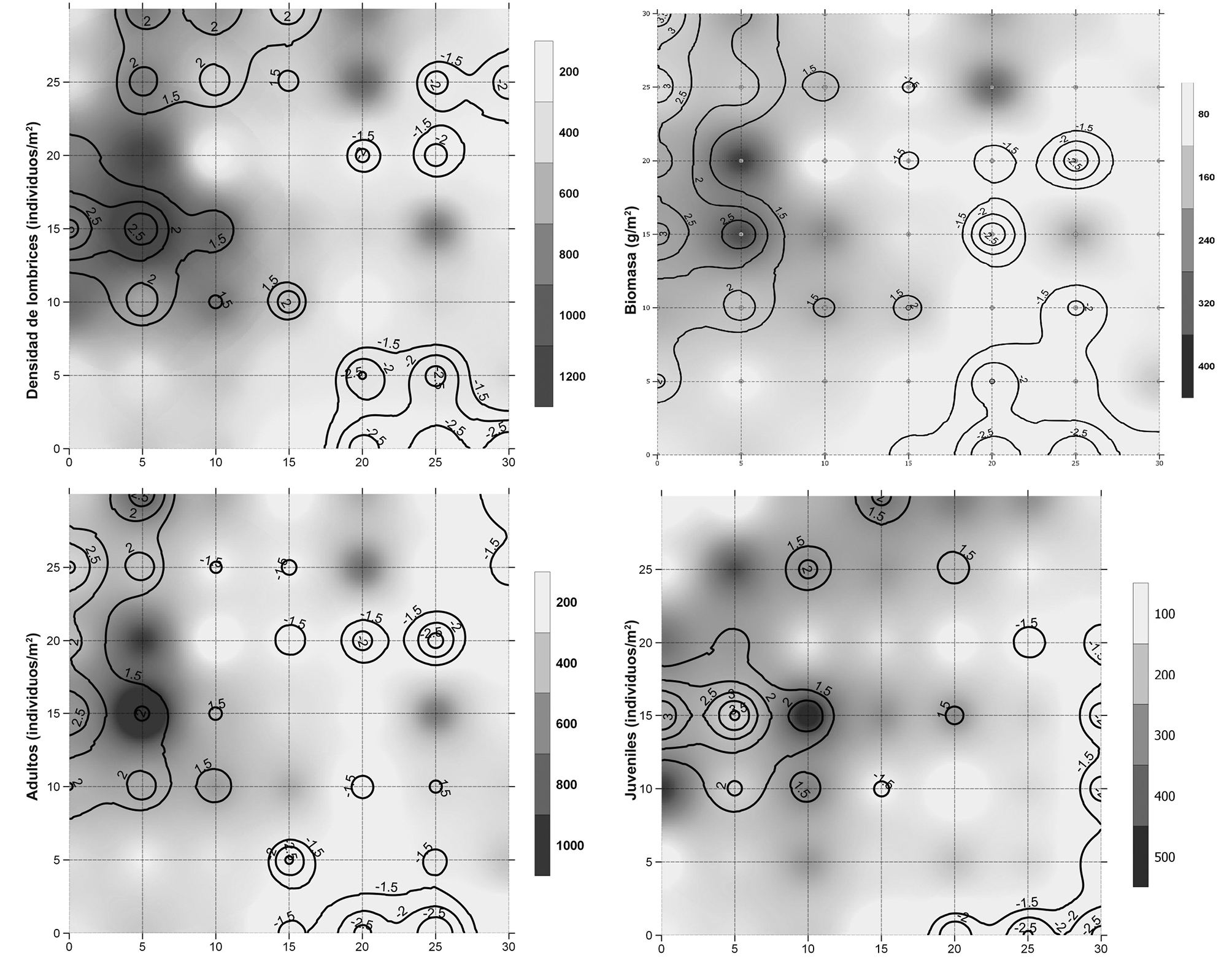 Los resultados del análisis SADIE muestran patrones agregados (tabla 1) significativos para la densidad total, adultos, juveniles y biomasa. En los mapas (figura 1) se evidencia la presencia de manchas y claros más intensos para la densidad y biomasa totales que para los adultos y juveniles . Los resultados de diversos estudios presentan distribuciones variables. Rossi et al. (2006) y Gutiérrez et al. (2010) observaron que la densidad de la comunidad de lombrices (todas las especies) tiene patrones agregados. Sin embargo, al evaluar poblaciones (individuos de una sola especie), algunas presentan patrones agregados (Rossi, 2003a y Rossi, 2003b) y otras aleatorios (Jiménez et al., 2011; Richard et al., 2012). En el presente trabajo, a nivel de comunidad de lombrices, se determinaron patrones agregados haciendo evidente que al analizar a nivel de comunidad la tendencia es la agregación, sea individuos adultos, juveniles o ambos.